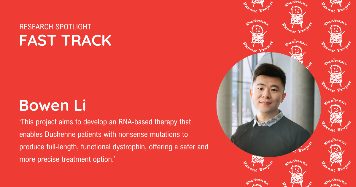 Duchenne Parent Project Nederland heeft een Fast Track subsidie toegekend aan onderzoeker Bowen Li. Specifiek richt zijn onderzoek zich op de ontwikkeling van een RNA-gebaseerde therapie voor Duchenne spierdystrofie (DMD). Met deze subsidie ondersteunen we kleinschalige onderzoeksinitiatieven die kunnen bijdragen aan betere behandelmogelijkheden en een hogere kwaliteit van leven voor mensen met Duchenne.