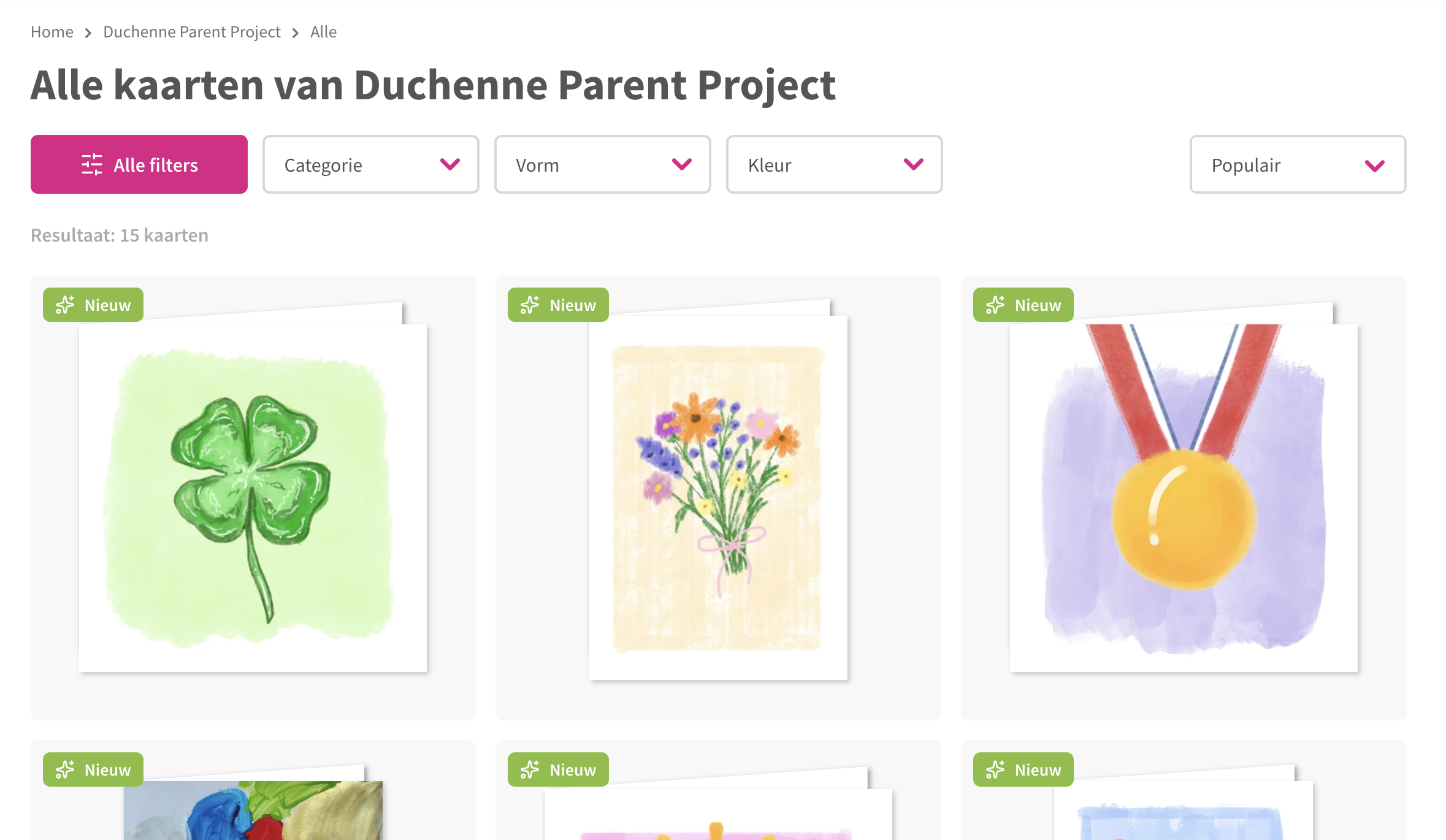 Deze collectie bestaat uit unieke ontwerpen die zijn gemaakt door mensen uit de Duchenne community. Met deze kaarten kunnen familie, vrienden en betrokkenen op een persoonlijke manier steun betuigen en bewustwording vergroten.