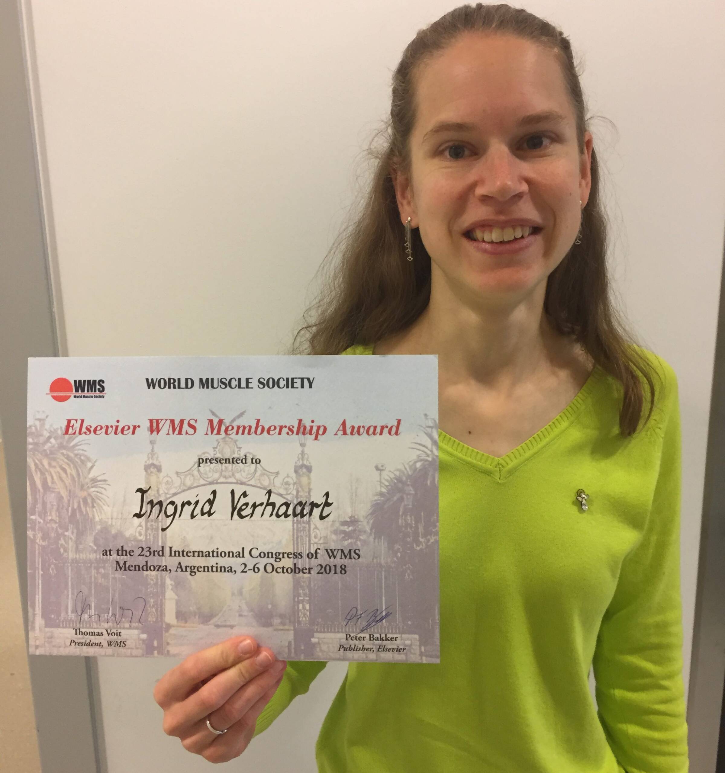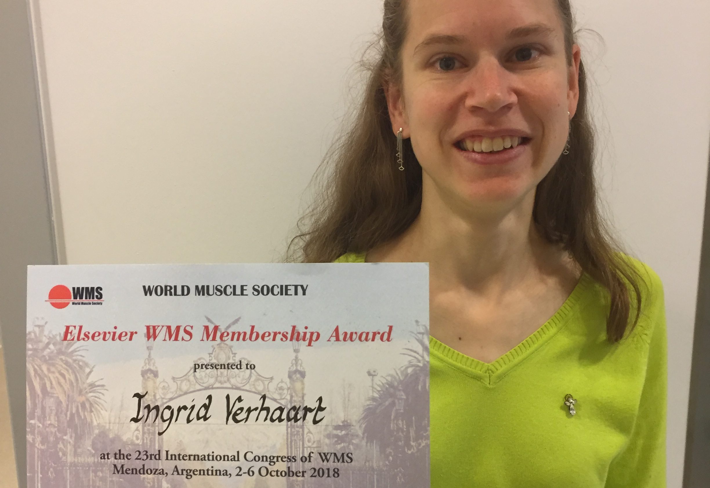 Ingrid Verhaart (LUMC/DPP NL) wint de Elsevier Award voor haar posterpresentatie “The importance of nutrition in Duchenne muscular dystrophy” op het World Muscle Society Congres in Argentinië.