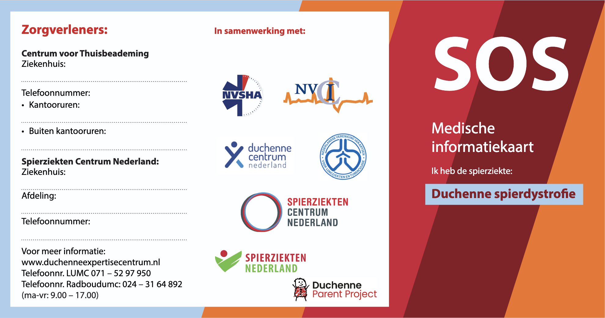 Het SOS-kaartje is bedoeld voor mensen met Duchenne spierdystrofie en helpt bij spoedsituaties. Als er acute medische hulp nodigis, is het belangrijk dat zorgverleners snel de juiste informatie hebben. Dit kaartje maakt dat mogelijk.