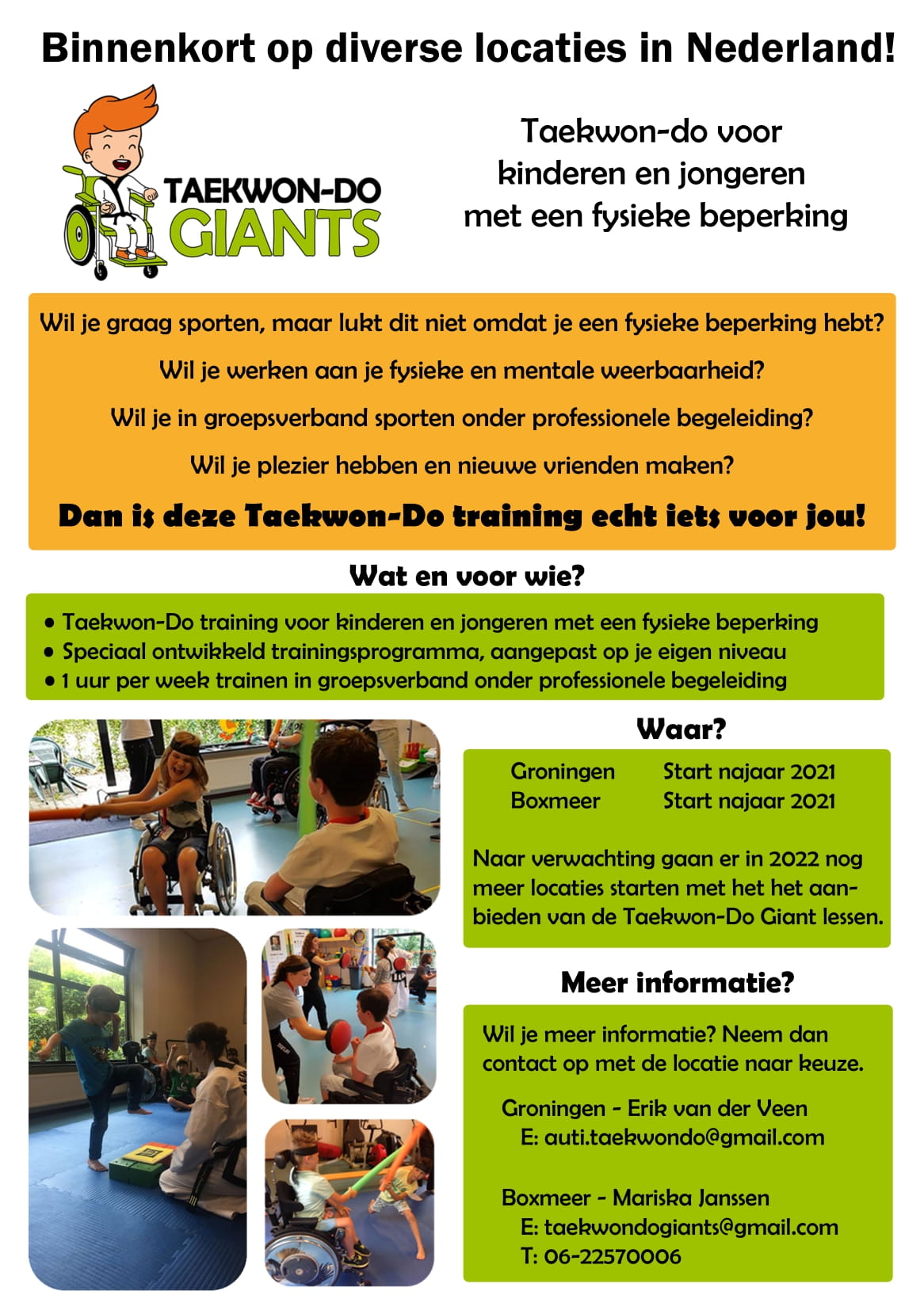 Dit najaar start de Taekwon-Do training voor kinderen en jongeren met een fysieke beperking in Groningen en Boxmeer. Wil je meer informatie? Neem dan contact op met de locatie naar keuze.